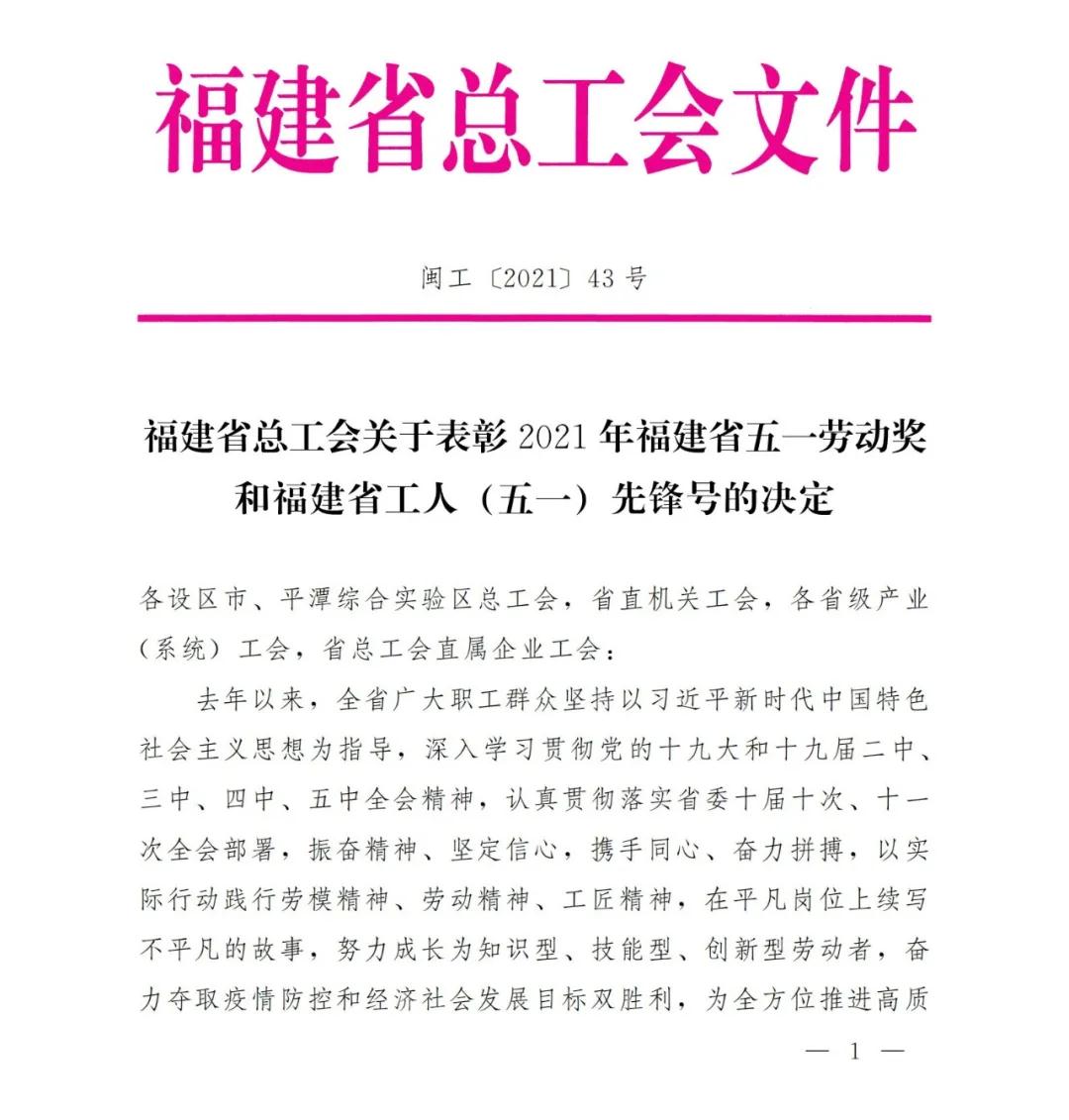 近日,省总工会通报表彰了2021年福建省五一劳动奖和福建省工人 (五一) 先锋号,福建省金字招牌,信誉至上 | 金年会开发集团有限公司荣获福建省五一劳动奖状。